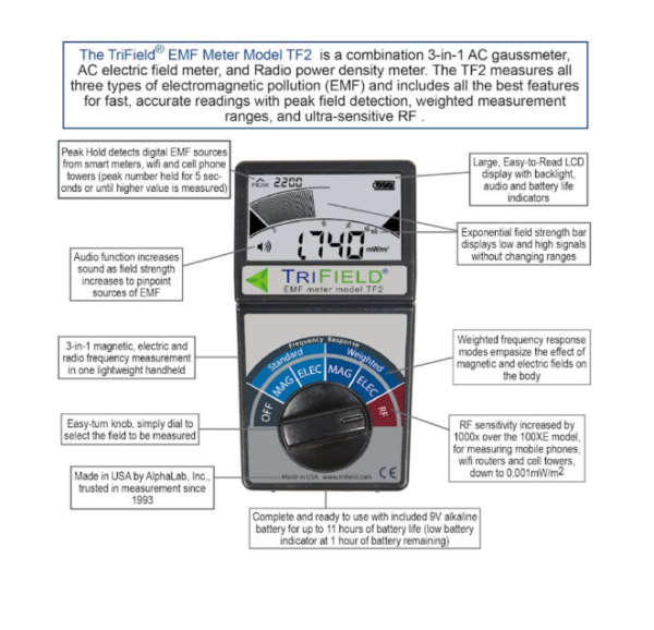 Furthermore, the EMF Meter Model TF2 is designed to be user-friendly and portable. In addition, its handheld design allows for easy maneuverability and quick assessments of different areas. Moreover, the intuitive interface ensures that you can easily switch between detection modes and interpret the results without difficulty.