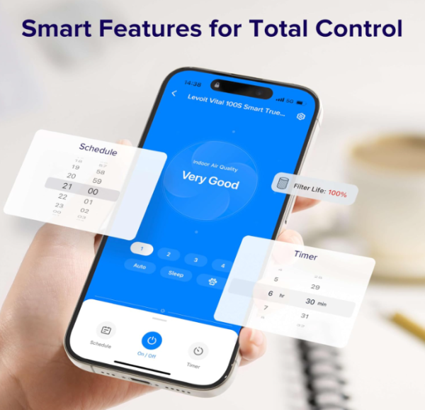 - Customizable Settings: Additionally, you can set precise start and end times for the Vital 100S-P, choosing fan speeds and modes like Pet Mode, Auto Mode, or Sleep Mode for different periods, ensuring optimal air quality around the clock.